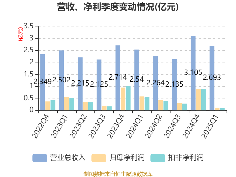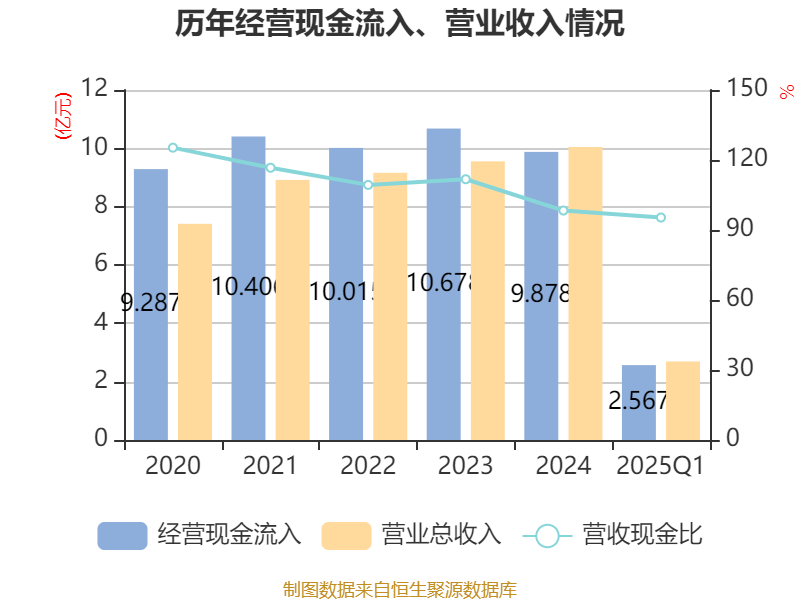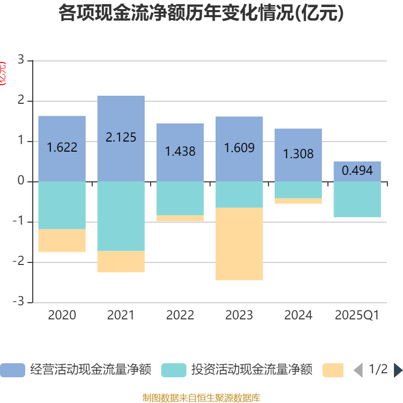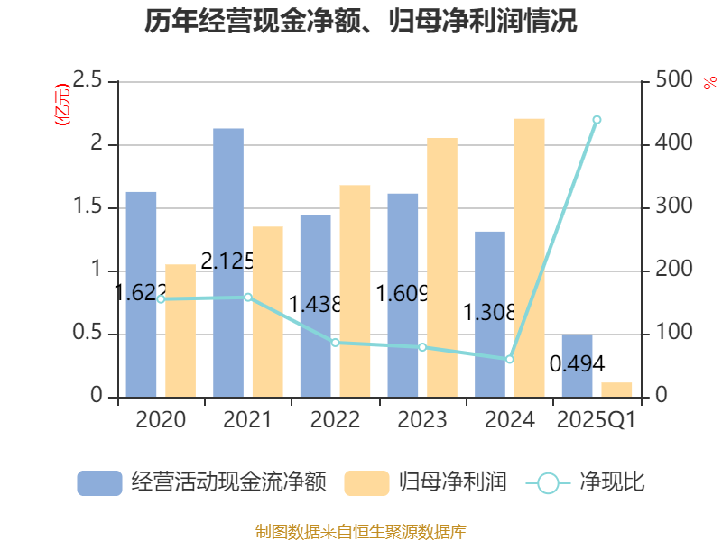 截至2025年一季度末,公司经营活动现金流净额为4940.71万元,同比增长140.97%;筹资活动现金流净额-36.05万元,同比减少219.2万元;投资活动现金流净额-8878.04万元,上年同期为132.96万元。