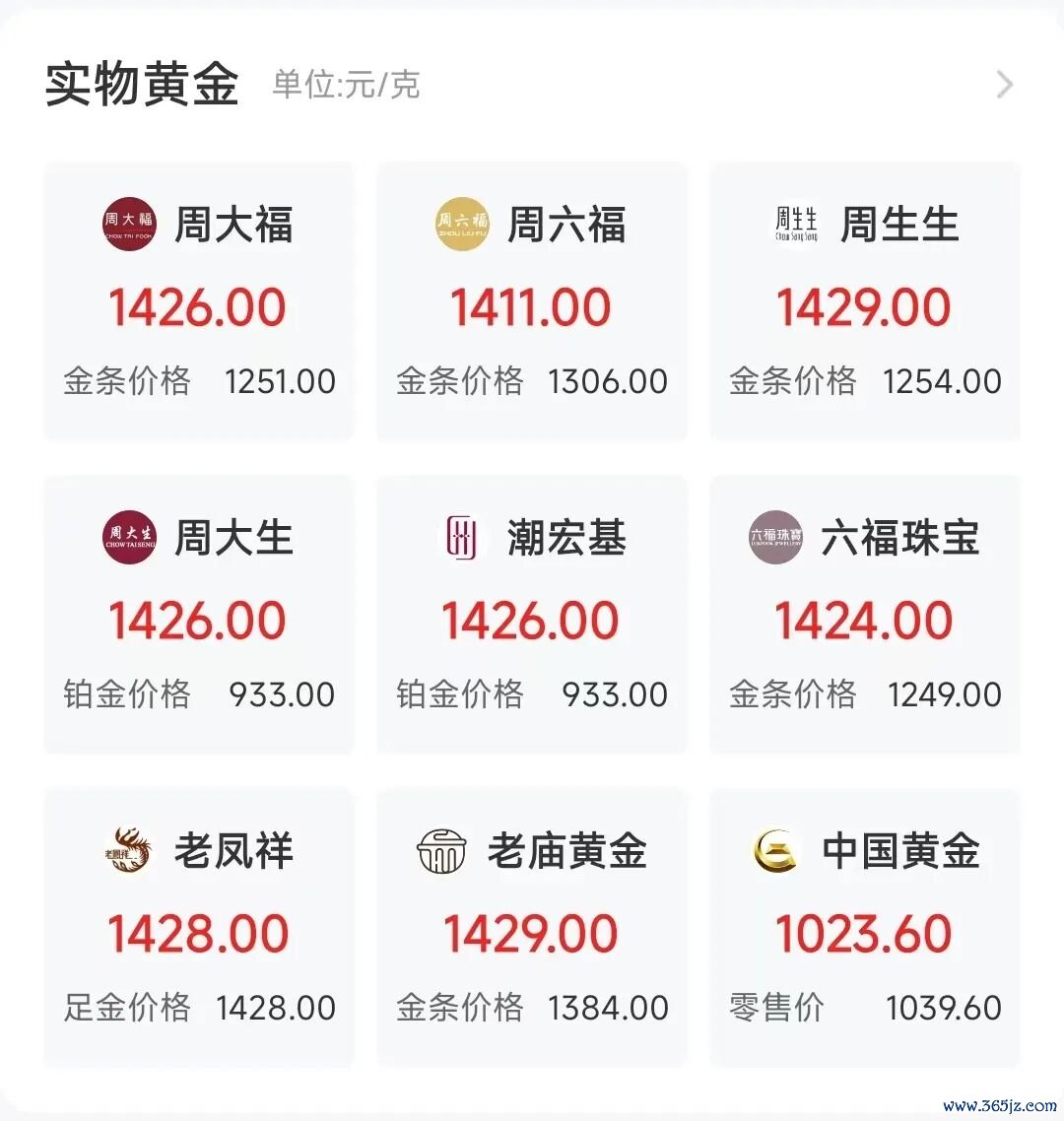 受国际金价带动,国内黄金饰品价格也普遍上涨,多个品牌足金报价突破1400元/克。其中,周生生、老庙报价1429元/克,周大福、周大生报价1426元/克,六福珠宝报价1424元/克,较昨日普遍上涨了20元/克。