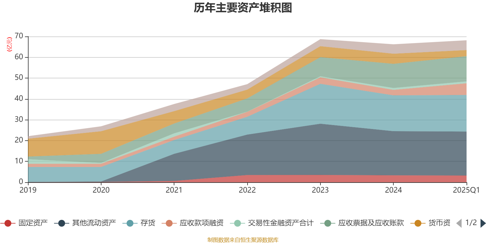 资产重大变化方面,截至2025年一季度末,公司应收款项融资较上年末增加115.34%,占公司总资产比重上升4.3个百分点;货币资金较上年末减少39.88%,占公司总资产比重下降3.05个百分点;其他流动资产较上年末减少0.22%,占公司总资产比重下降0.98个百分点;固定资产较上年末减少3.9%,占公司总资产比重下降0.33个百分点。