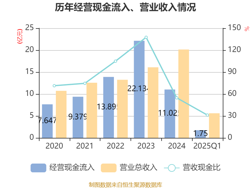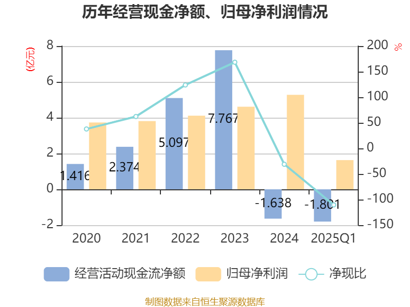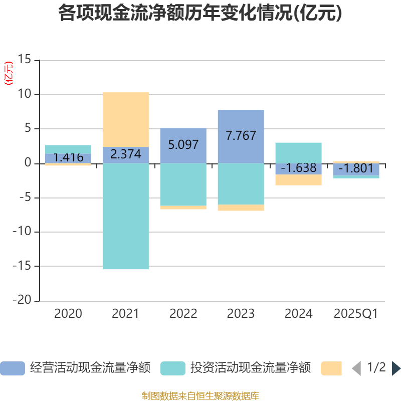 截至2025年一季度末创盈在线,公司经营活动现金流净额为-1.8亿元,同比减少1.49亿元;筹资活动现金流净额2720.73万元,同比增加7807.55万元;投资活动现金流净额-3867.18万元,上年同期为-656.33万元。