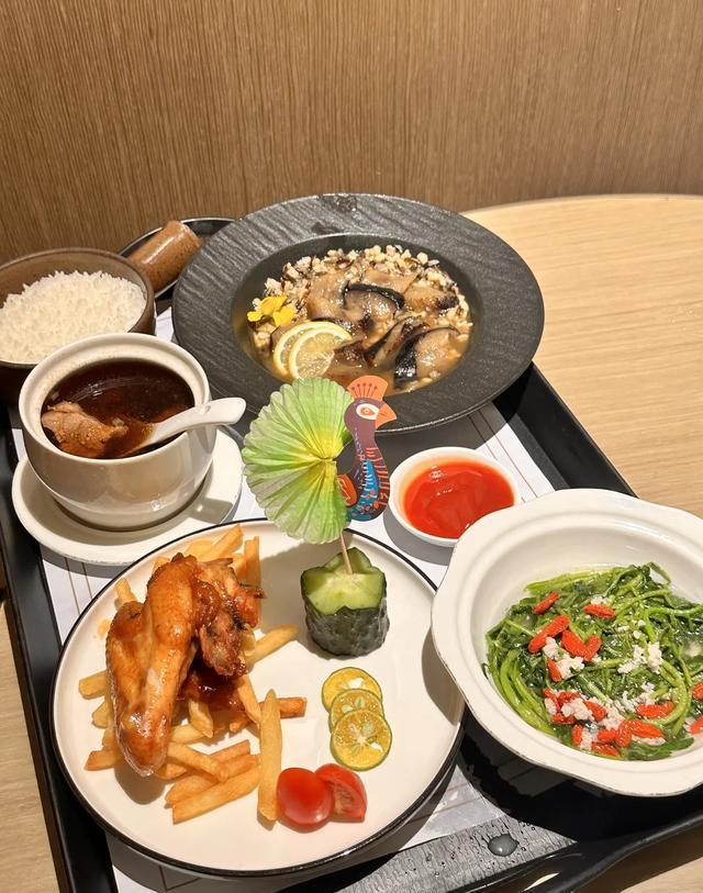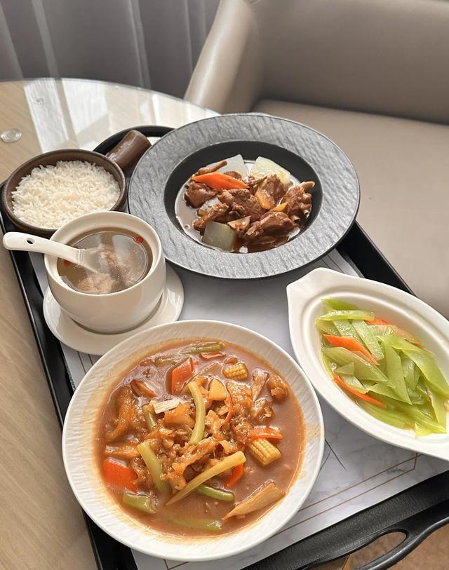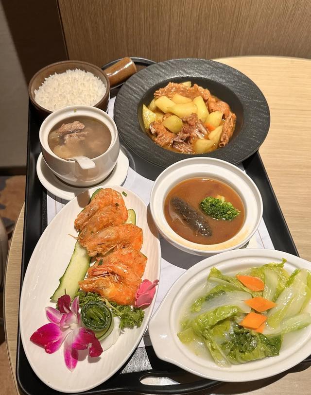 网图里那九份餐,红枣牛尾、麻油猪肝、藜麦饭、低糖甜品,摆盘像日料店,热量算到100卡区间。