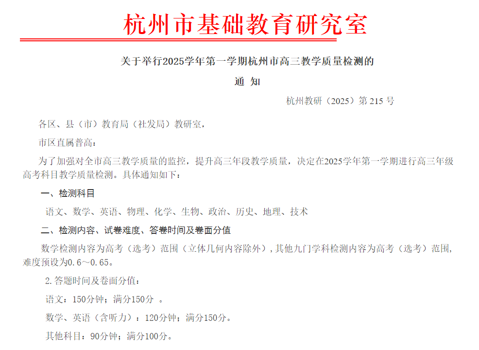 潮新闻也查看了杭州市教育局基础教育研究室在8月25日发布的《关于举行2025学年第一学期杭州市高三教学质量检测的通知》,其中就明确数学检测内容为高考(选考)范围(立体几何内容除外),其他九门学科检测内容为高考(选考)范围,难度预设为0.6~0.65。这个难度系数跟去年保持一致。
