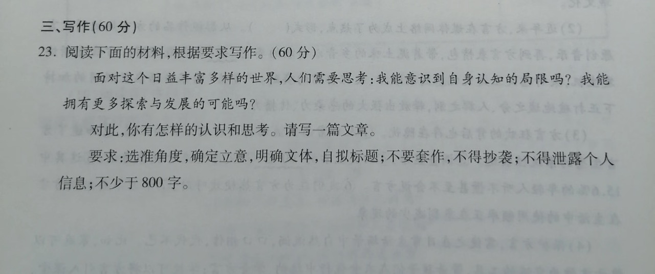 第一天的语文,作文题目是关于认知局限与探索可能性:“面对这个日益丰富多样的世界,人们需要思考:我能意识到自身认知的局限吗?我能拥有更多探索与发展的可能吗?对此,你有怎样的认识和思考。请写一篇文章……”