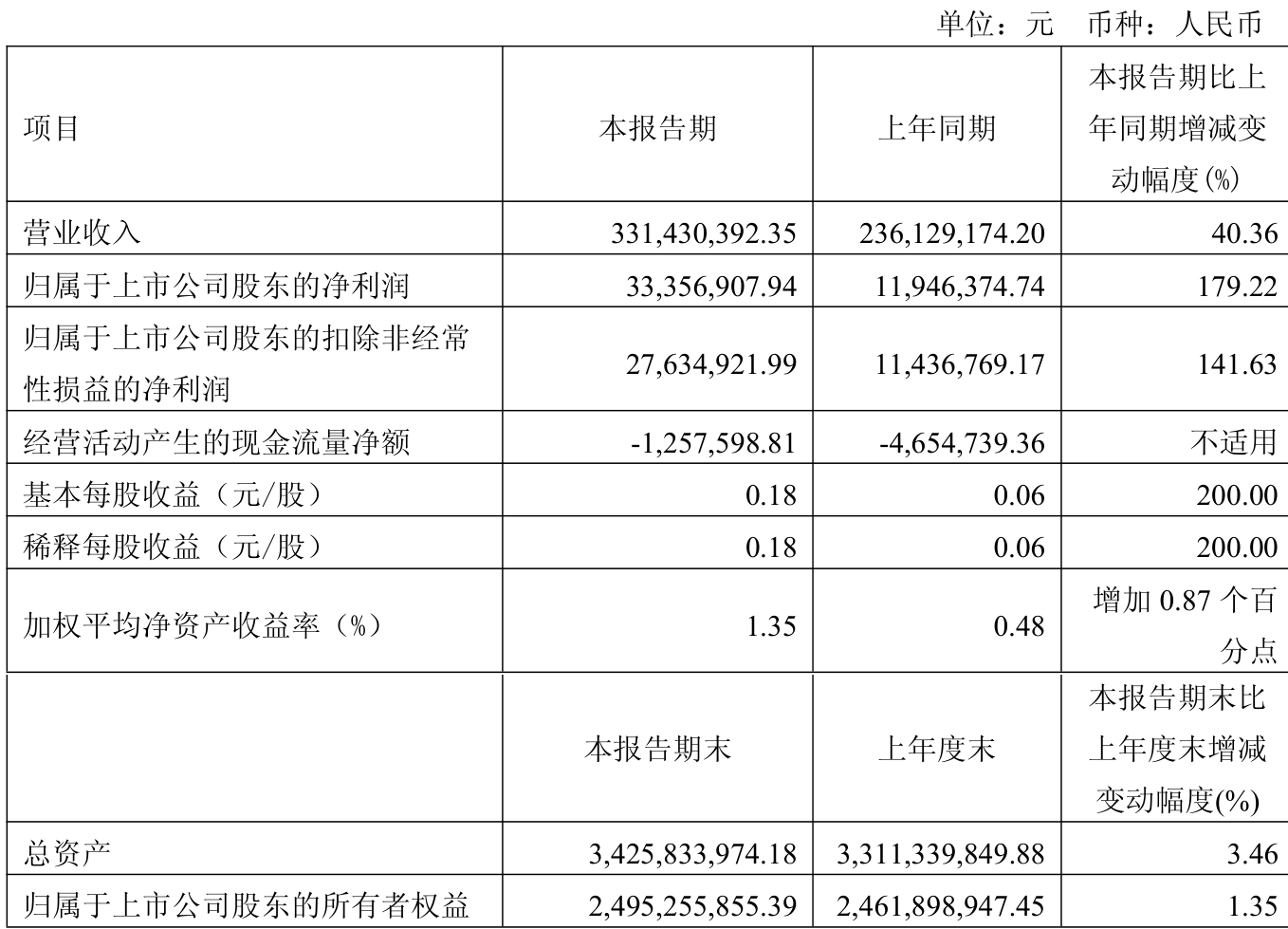 中证智能财讯越剑智能(603095)4月26日披露2025年第一季度报告。公司实现营业总收入3.31亿元,同比增长40.36%;归母净利润3335.69万元,同比增长179.22%;扣非净利润2763.49万元,同比增长141.63%;经营活动产生的现金流量净额为-125.76万元,上年同期为-465.47万元;报告期内,越剑智能基本每股收益为0.18元,加权平均净资产收益率为1.35%。