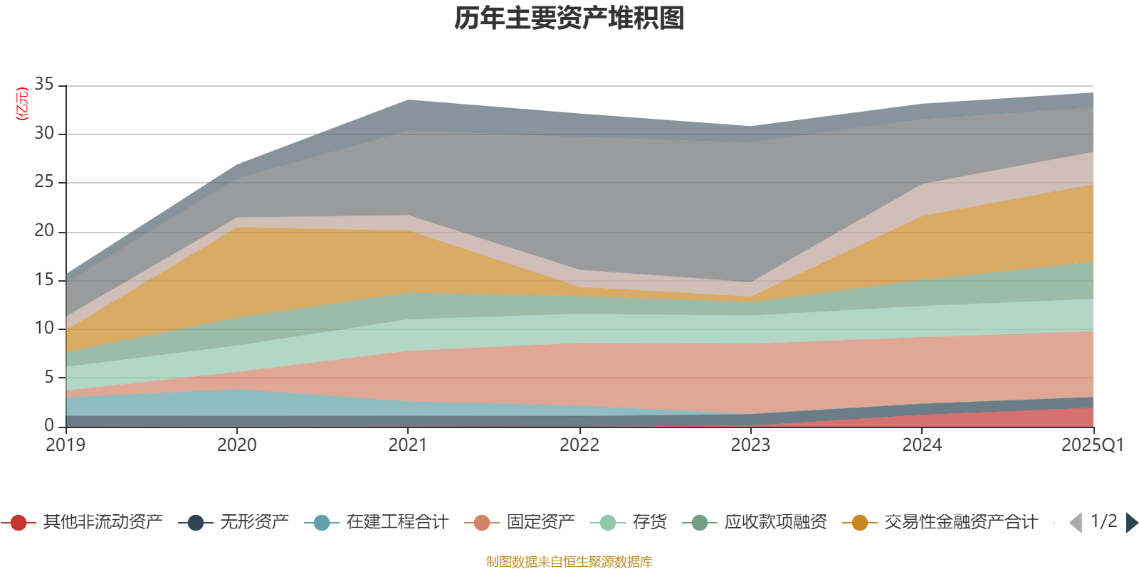 资产重大变化方面,截至2025年一季度末,公司货币资金较上年末减少31.67%,占公司总资产比重下降6.81个百分点;交易性金融资产合计较上年末增加21.5%,占公司总资产比重上升3.44个百分点;应收款项融资较上年末增加42.32%,占公司总资产比重上升3.04个百分点;其他非流动资产较上年末增加58.77%,占公司总资产比重上升1.98个百分点。